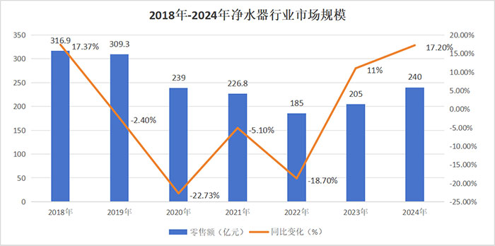净水器作为一种高效、便捷的饮用水处理设备,在过去几年中经历了从快速增长到结构调整的演变。2022年,我国净水器零售额规模为185亿元,同比下降18.7%,零售量为739万台,同比下降20.2%。到了2023年,市场逐步复苏,净水器零售额达到205亿元,同比增长11%,零售量为802万台,同比增长9%。