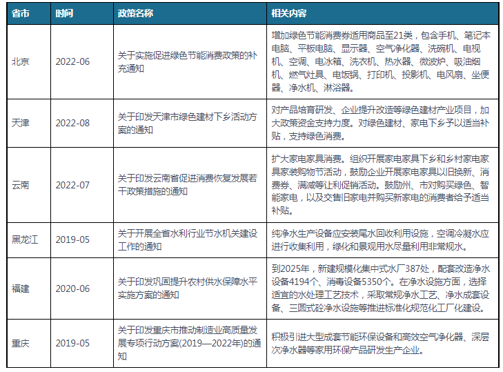 与此同时,各省市加强对净水器行业的政策支持,如北京发布《关于实施促进绿色节能消费政策的补充通知》,增加绿色节能消费券适用商品至21类,包含手机、笔记本电脑、平板电脑、显示器、空气净化器、洗碗机、电视机、空调、电冰箱、洗衣机、热水器、微波炉、吸油烟机、燃气灶具、电饭锅、打印机、投影机、电风扇、坐便器、净水机、淋浴器。