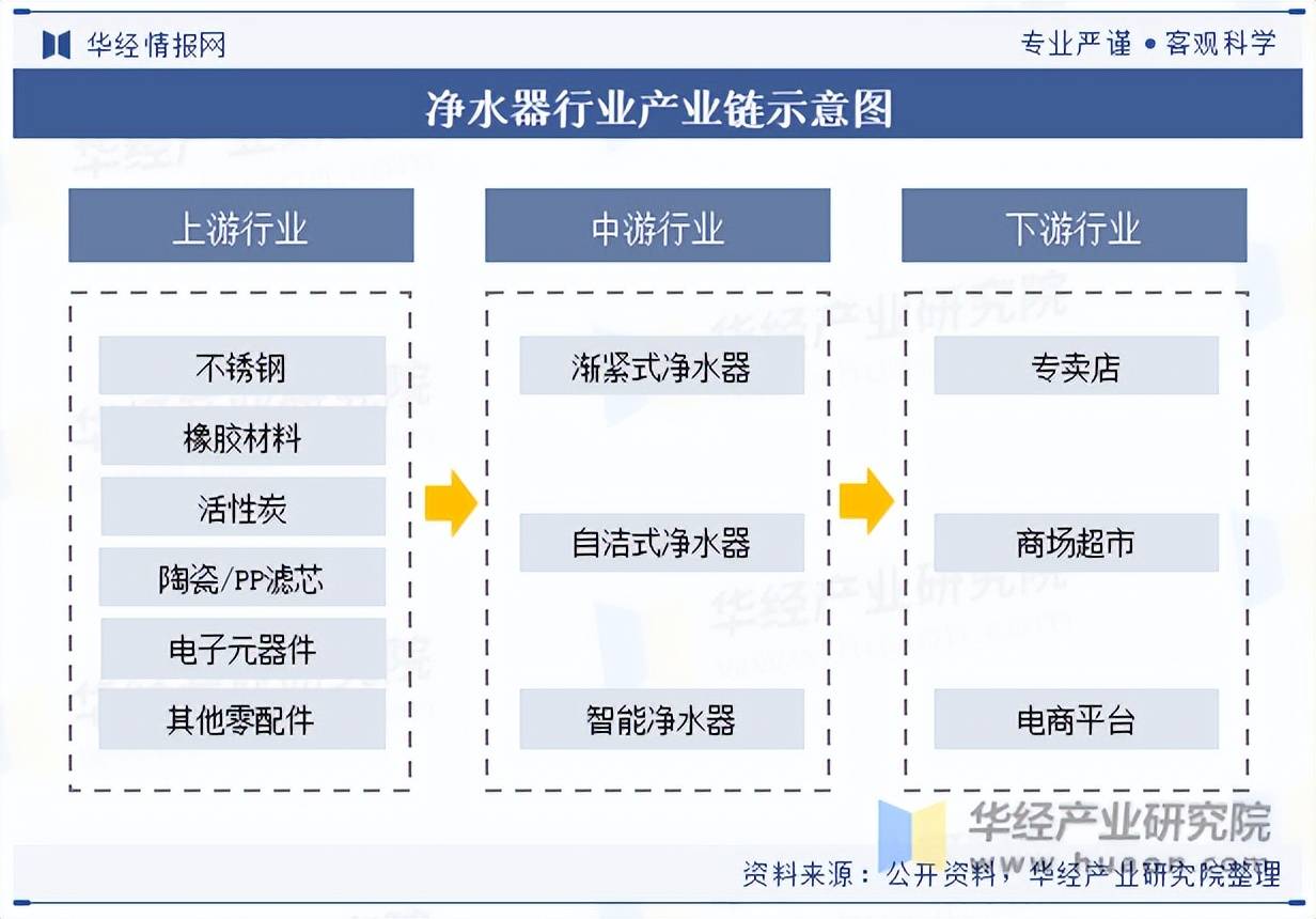 从净水器的产业链来看,上游主要是生产各种净水器所需零部件的零部件供应商或材料供应商。其中,主要零部件包括电子元器件、橡胶材料、PP滤芯等。中游主要为净水器的制造环节,包括渐进式净水器、自洁式净水器以及智能净水器的制造。净水器产业的下游则主要销售渠道,包括商超、品牌专卖店、电商环节等渠道,销售终端为消费者。