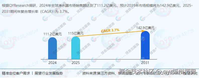 净水器是通过物理(如过滤、吸附)、化学(如离子交换)或生物技术去除水中杂质、污染物及有害物质的设备,核心功能是提供安全饮用水。根据QYResearch最新调研报告显示,2024年全球市场规模达111.2亿美元,预计2031年增至142.9亿美元,2025-2031年复合增长率(CAGR)为3.7%。